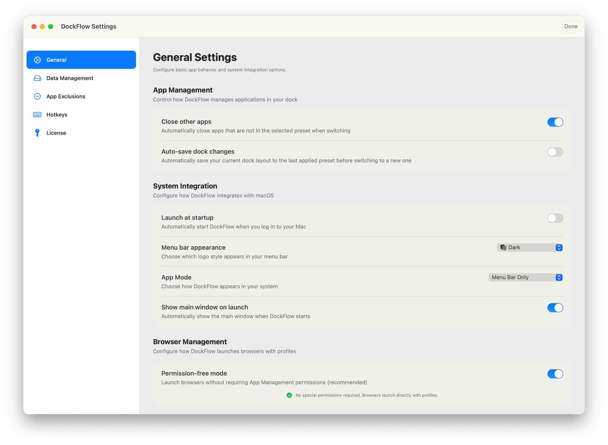 For non-technical users who prefer manual control, DockFlow still delivers value through hotkey-based preset switching. The automation features become optional power user capabilities rather than mandatory requirements.