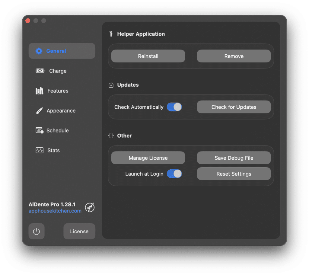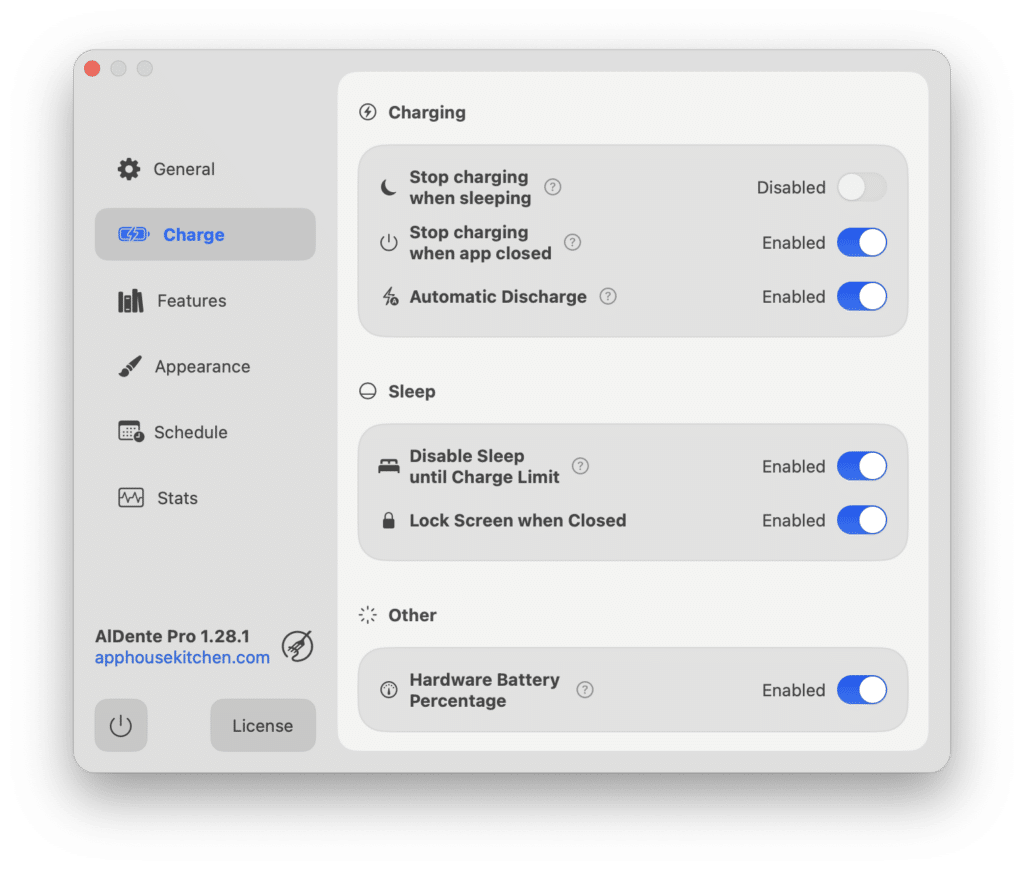 AlDente’s core feature is its Charge Limiter, allowing you to stop your battery from charging past a specific percentage. For those who want even more control, Discharge Mode lets your Mac run on battery even while plugged in, ideal for keeping your battery percentage within the optimal range.