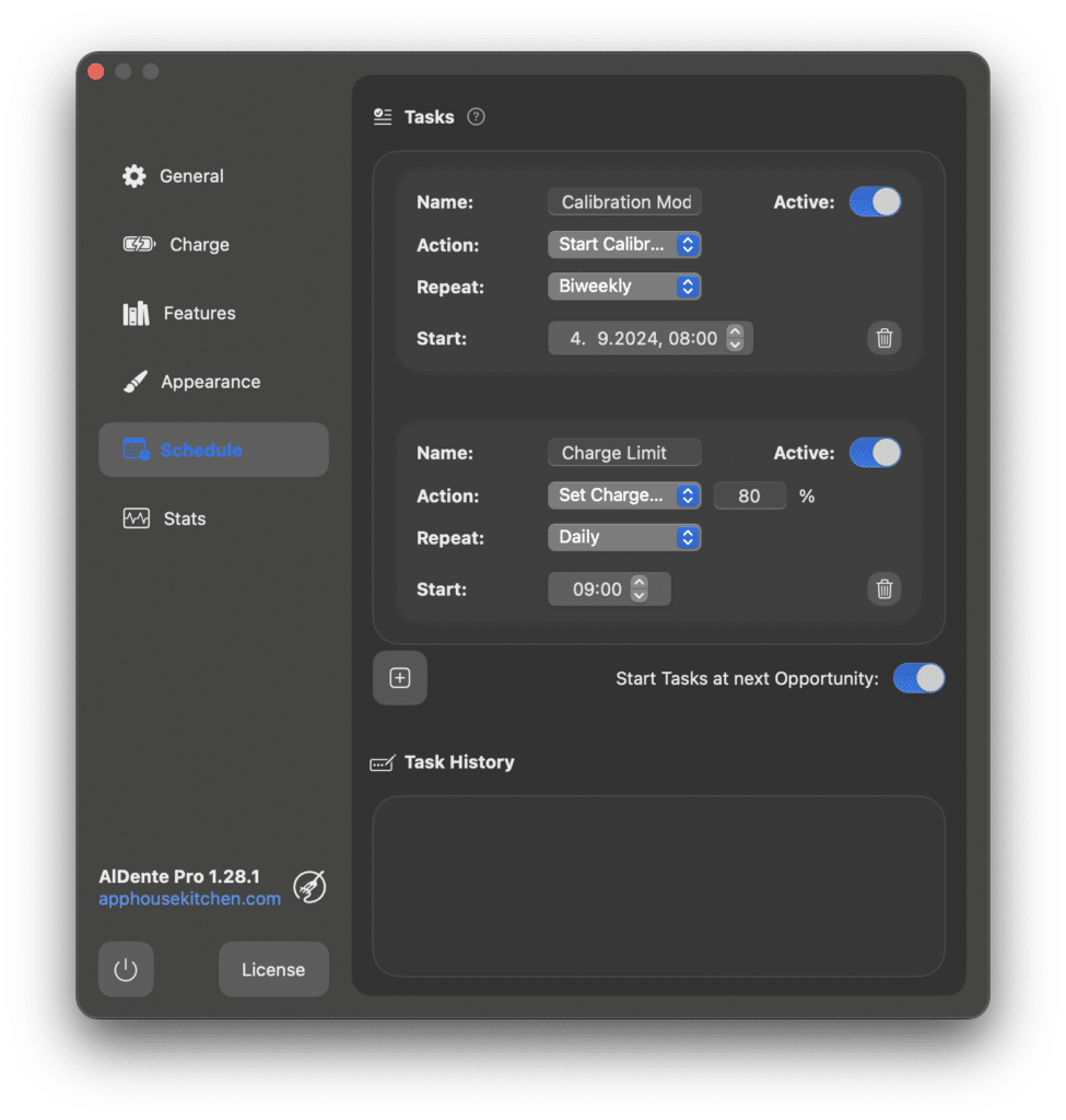 For automation lovers, AlDente supports Apple Shortcuts, enabling custom battery automation routines. There’s even a Schedule Mode, allowing you to set specific actions to run on certain days—like ensuring a full charge before a long trip.