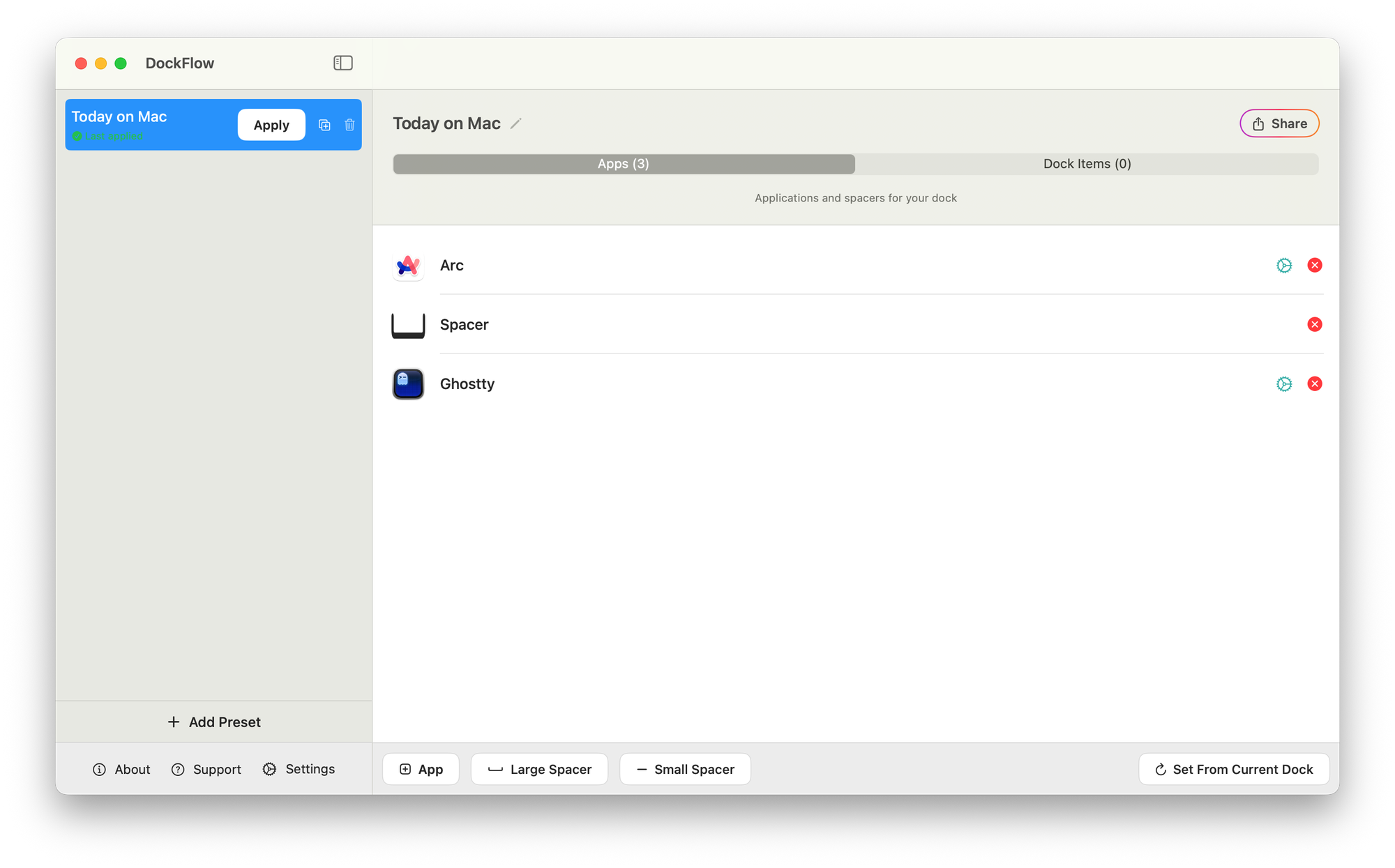 The setup process respects your existing workflow. Load your current Dock as a starting point, then add, remove, or rearrange apps to match a specific context. Each preset saves exactly what you want visible.