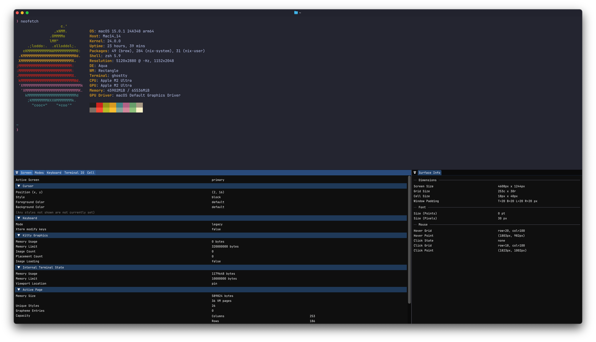 Ghostty is stacked with unique features, each crafted to elevate the terminal experience. For starters, there’s the Terminal Inspector—a real-time debugging tool that lets you peer into every detail of your terminal’s activity, from keystrokes to render timings. Ever wonder why something’s slowing down? The Terminal Inspector will show you precisely what’s happening under the hood, offering insight and transparency rarely seen in terminal emulators.