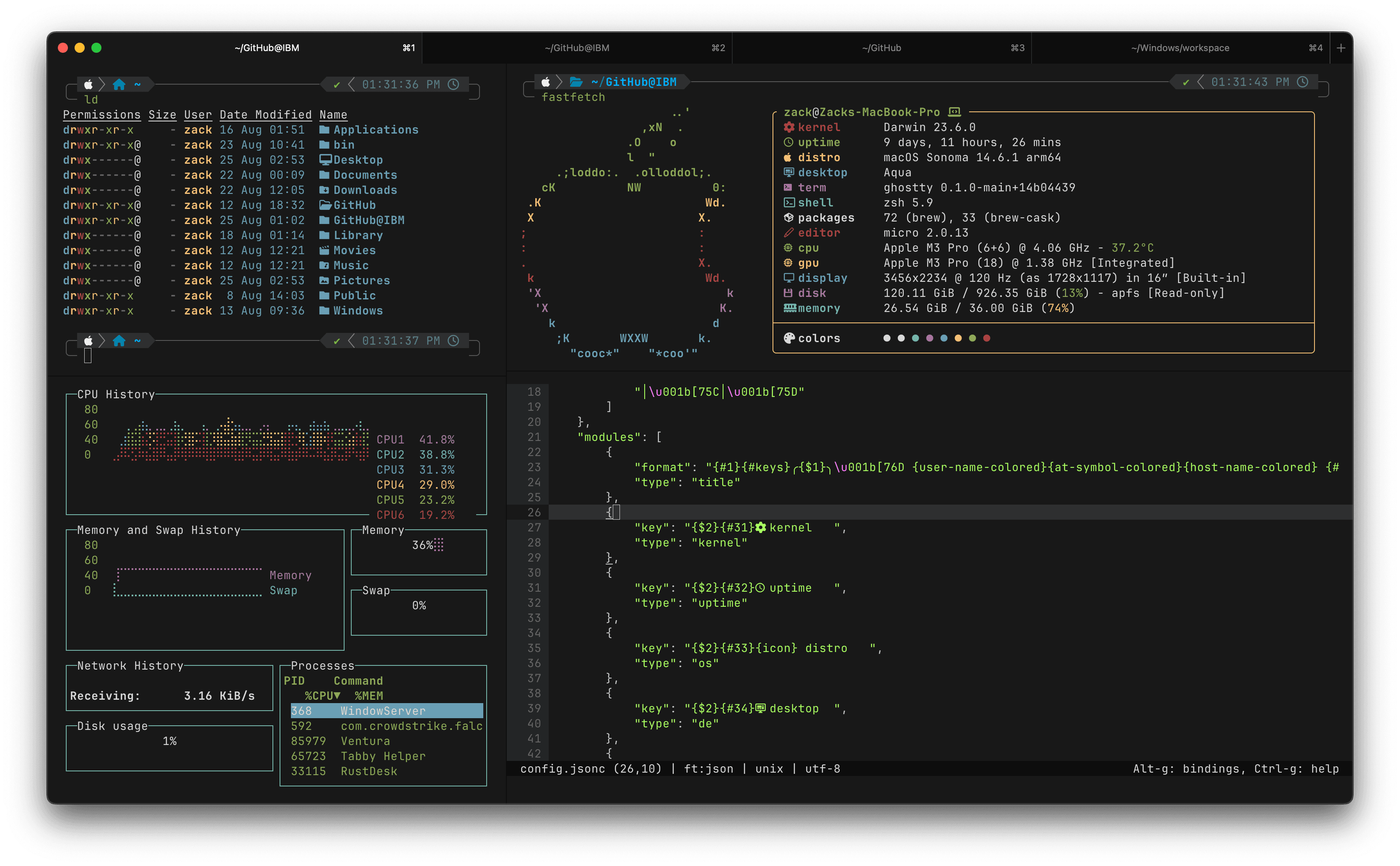 Ghostty is also big on leveraging native system libraries like GTK and UIKit, meaning you get baked-in features like native tabs that provide a familiar experience. On macOS, for instance, the tab view is powered by UIKit’s native component, giving Ghostty a polished, authentic macOS feel that’s hard to replicate with custom libraries. Ghostty even supports native system fonts, blending in seamlessly with your OS to make you feel at home, whether you’re on macOS or Linux (with Windows support still in progress).