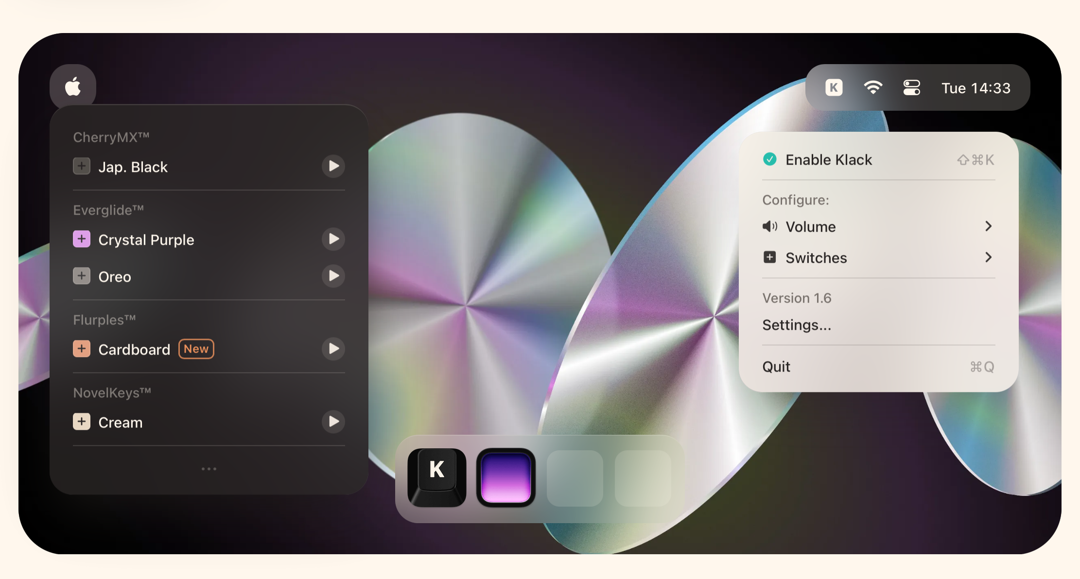 Klack isn't here to optimize your workflow or boost your productivity. At its core, Klack is a native Swift app that brings mechanical keyboard sounds to your Mac with zero lag – something that sets it apart from other apps that sound like they're trying to catch up with your fingers. The developer has clearly spent some serious time getting the audio just right, with separate sounds for key-up and key-down strokes. It's the kind of attention to detail that makes you go "noice" before spending the next hour typing random words just to hear the different sounds.