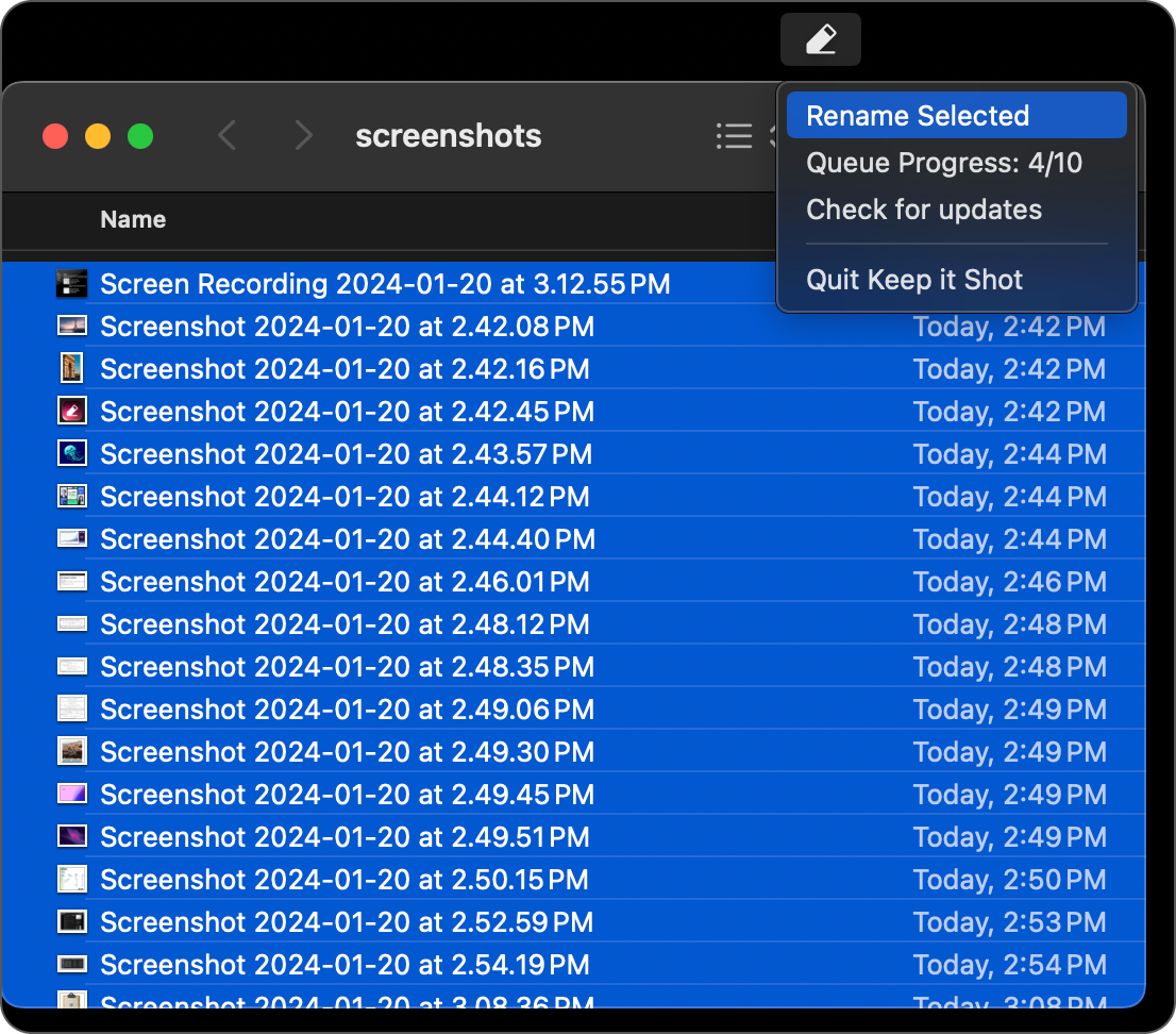Sure, you could manually rename every screenshot, but who has time for that? Keep It Shot automates the entire process, so you can focus on things that actually matter—like staring blankly at your inbox. It also allows you to rename screenshots in bulk, so you can clean up months (or years) of screenshot clutter in a matter of seconds. And if you ever don’t like a suggested name, you can simply revert back to the original filename with a click.