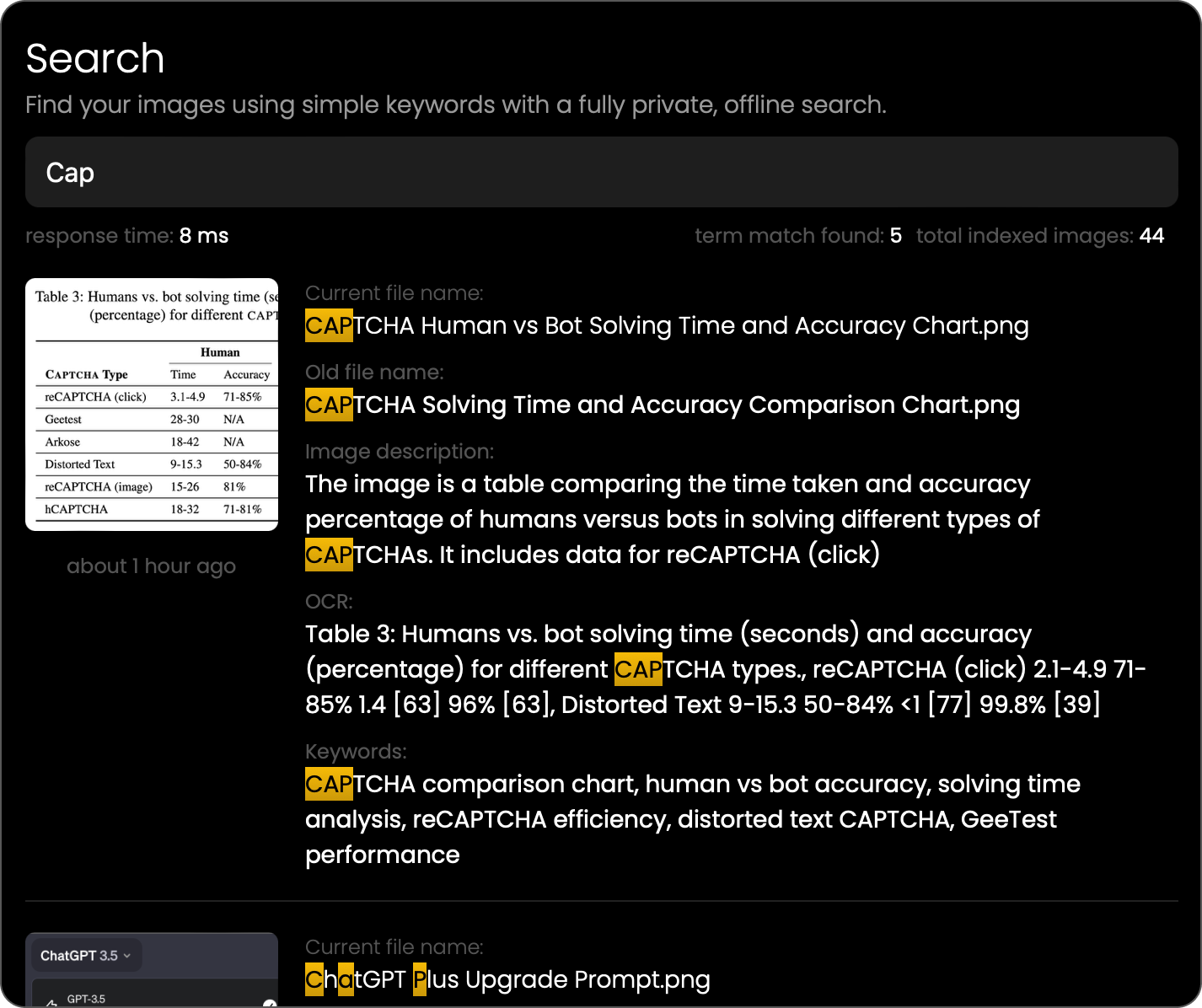The real power of Keep It Shot lies in its offline search index. The app doesn’t just rename files; it also analyzes them, generates keywords, and lets you search using natural language. That means instead of digging through folders, you can simply type “meeting notes” or “design mockup” and instantly pull up the relevant screenshot. And because everything is stored locally, searching is lightning-fast and private—no cloud uploads or sketchy data tracking involved.