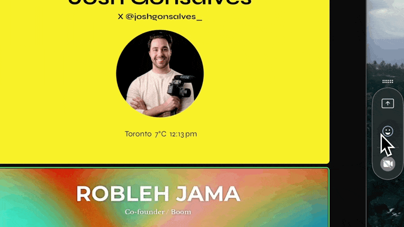 The themes feature is where Boom really stands out. In addition to over 30 preset themes (which can be edited), Boom allows you to create your own themes. Themes elevate your standard video feed into a branded visual experience. These themes work whether your camera is on or off. When the camera is off, Boom allows you to create a customizable poster that keeps you present in the meeting, ensuring your visual identity remains consistent even when you're not on screen. You can add your name, title, logo, stickers, and more.