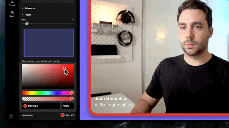 If you’re particular about your appearance, Boom's advanced camera controls offer studio-level adjustments. Presets like Studio and Noir provide one-click enhancements, while individual parameters like brightness, contrast, hue, and saturation can be fine-tuned to your preference. Boom users can also adjust the resolution (up to 4k) and the frame rate (up to 60 FPS). Boom also provides you with the ability to add padding, zoom, and pan to ensure you're always perfectly framed regardless of your physical setup.