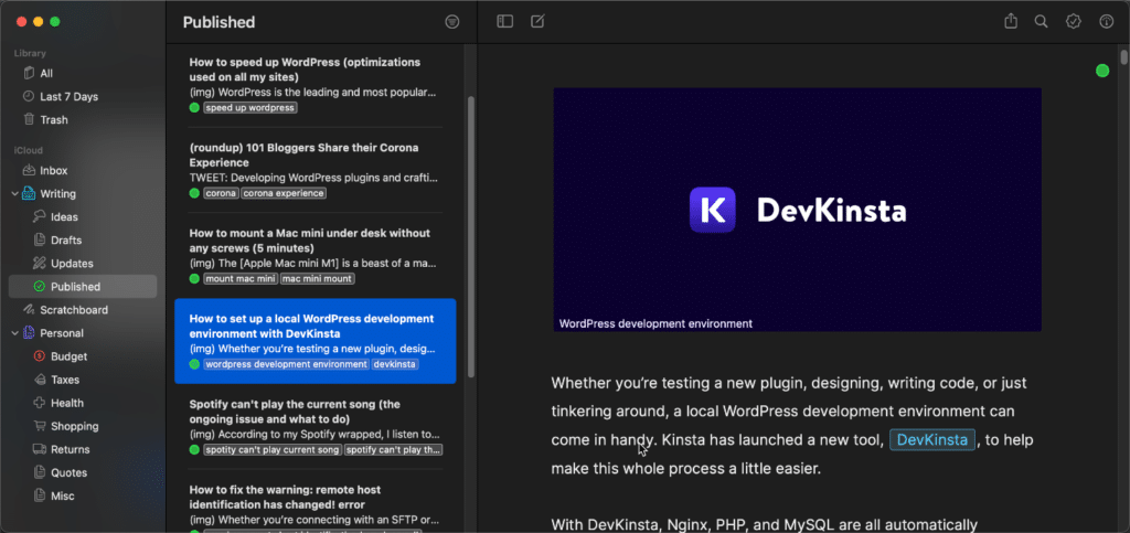 Ulysses also excels at organization. Your notes, drafts, and projects are stored in a unified library, so everything’s always at your fingertips. If you’re juggling multiple clients or projects, the ability to create folders and subfolders is a lifesaver. And thanks to iCloud sync, your work is safe, secure, and accessible across all your Apple devices.